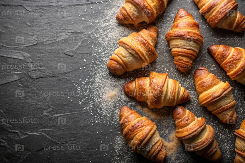 Вкусные свежевыпеченные кроассанты на тёмном фоне сланца. французский завтрак. хорошие ближневые выпечки. пекарня со вкусным хлебом. кондитерские изделия