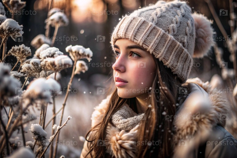 Зимний портрет. Близкий план молодой девушки в вязанной шляпе, шарфе и наружной куртке