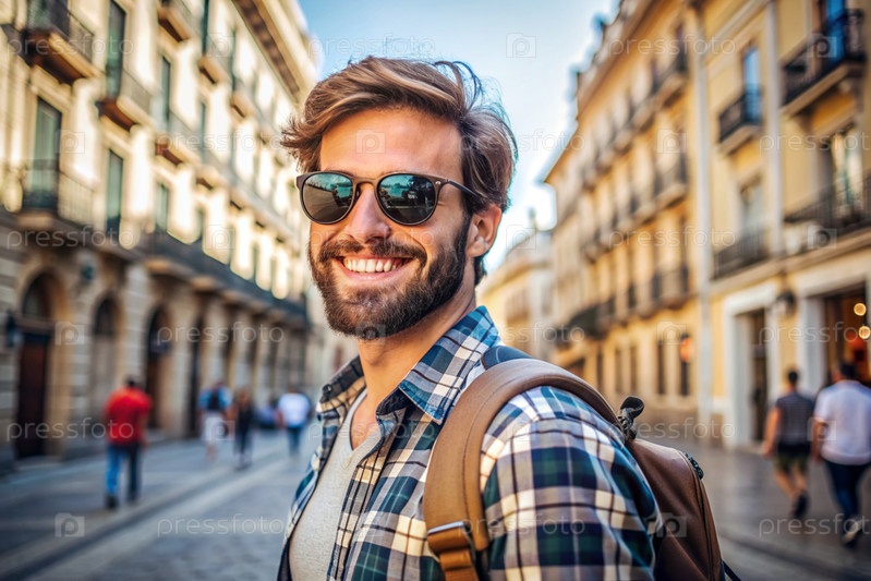 Портрет счастливого красивого хипстера-путешественника с рюкзаком и солнцезащитными очками. Сольное путешествие, образ жизни. Молодой турист наслаждается отдыхом в солнечный день