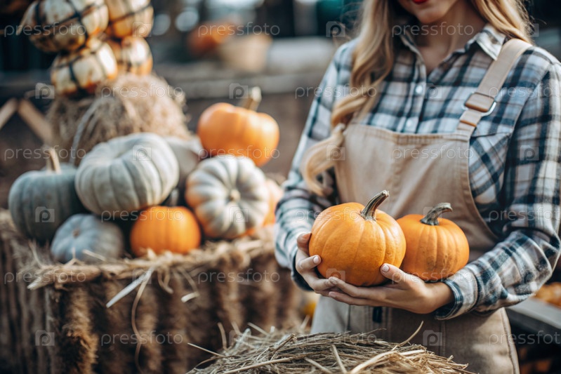 Руки женщины в квадратной рубашке с тыквенным крупным планом и красивым осенним рисунком. Сбор тыков. Концепция празднования Дня благодарения и Хэллоуина