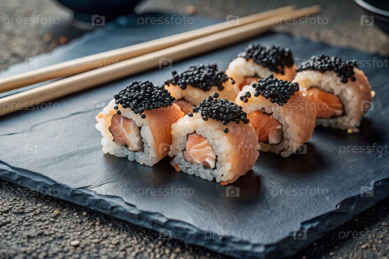 Японская еда. Суши-роллы Калифорния, Филадельфия с угорьем, красной икры и лососем. Концепция меню суши-бара