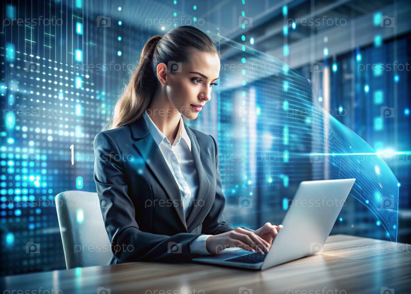 Красивая молодая женщина в костюме работает на ноутбуке в офисе с цифровыми кодами на виртуальном экране Цифровые технологии будущего Разработка программного обеспечения
