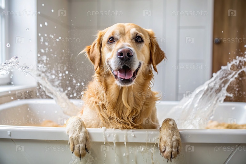 Золотой ретривер купается в пузырьковой ванне. Помыть собаку. Концепция ухода за домашними животными