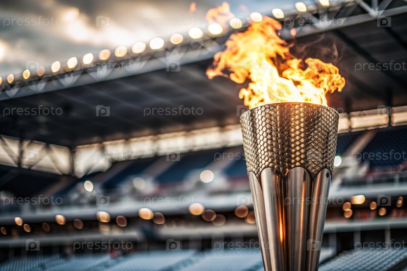 Пламя олимпийского факела горит на фоне спортивного стадиона, арены и красивой размытой стороны