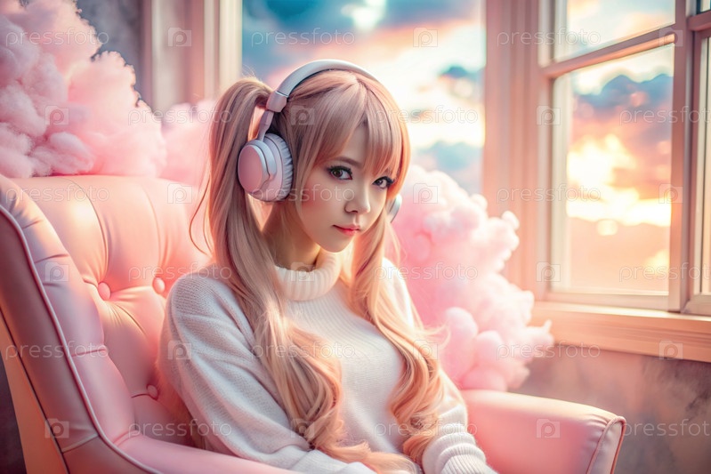 Молодая красивая японская девушка с розовыми волосами в аниме слушает музыку на беспроводных наушниках в розовых облаках