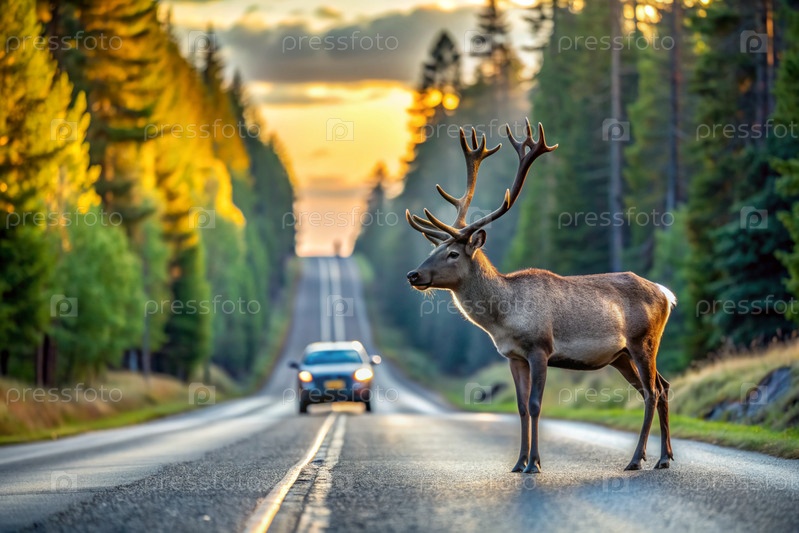 ДТП.Животное - это олень на дороге возле леса рано утром.Дорожные опасности, дикая природа и транспортное средство