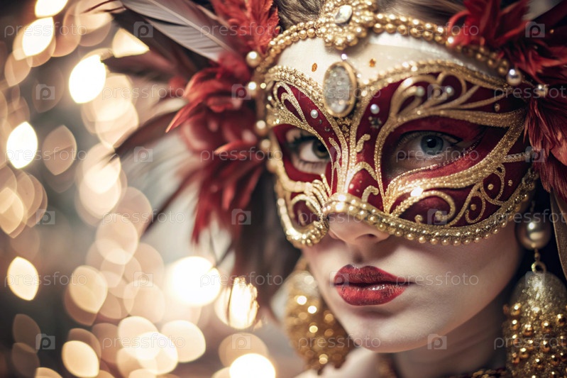 Карнавал Венеции.Закрытие женщины в украшенной карнавальной маске.Яркие цвета передают атмосферу празднования и роскоши