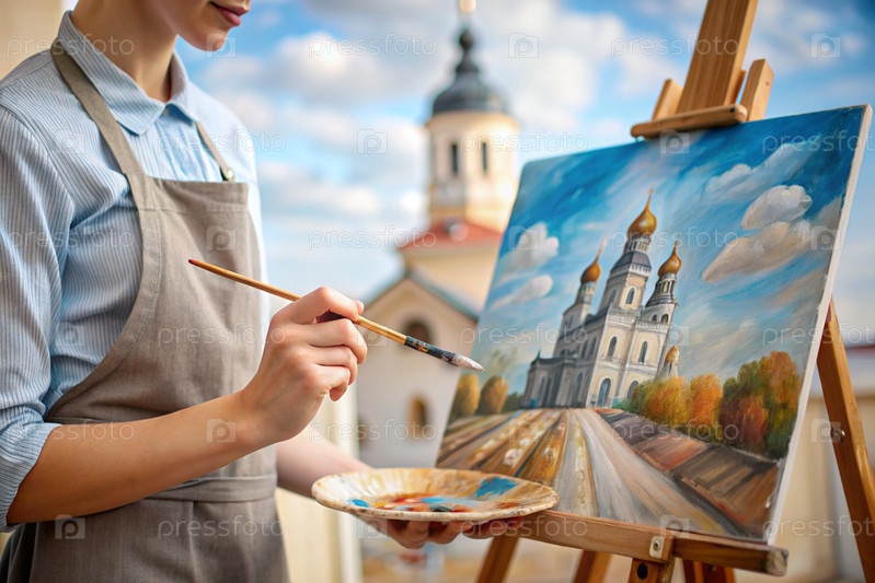 Художник рисует картину с масляными красками на холсте.На картинке изображена православная церковь, храм.Религия, творчество и отдых