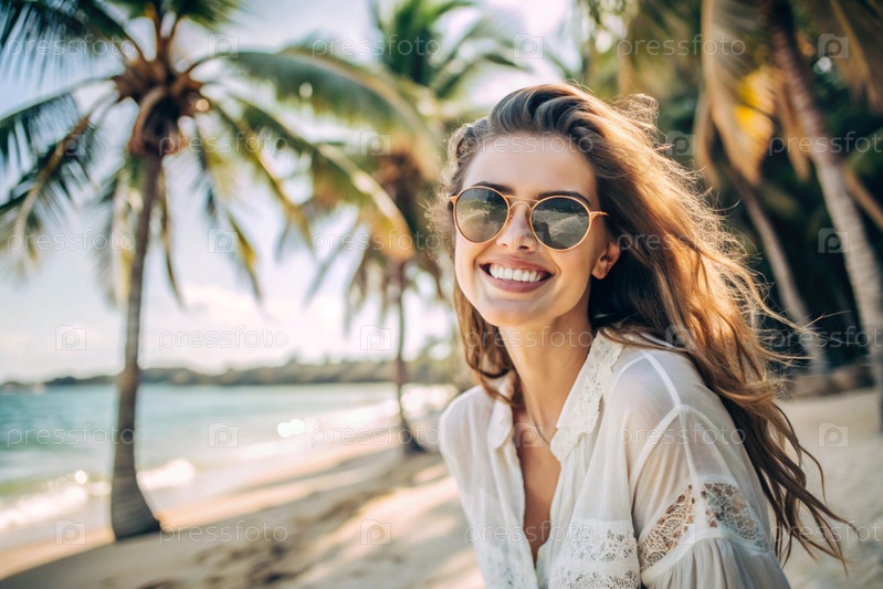 Красивая девушка в белой хлопковой рубашке и солнцезащитных очках на океане на фоне пальмовых деревьев. она улыбается и смотрит в камеру. летние каникулы и праздники