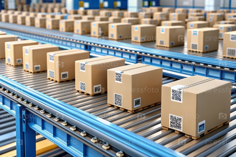 Интеллектуальная автоматическая упаковка посылок на складе, теги и QR-коды в картонные коробки для эффективного отслеживания, аутентификации и слежения