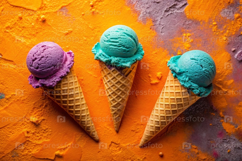 Сладкий десерт. Стильная современная концепция. Туркуазный, фиолетовый, розовый конус мороженого на ярко-оранжевом фоне. Всемирный день мороженого