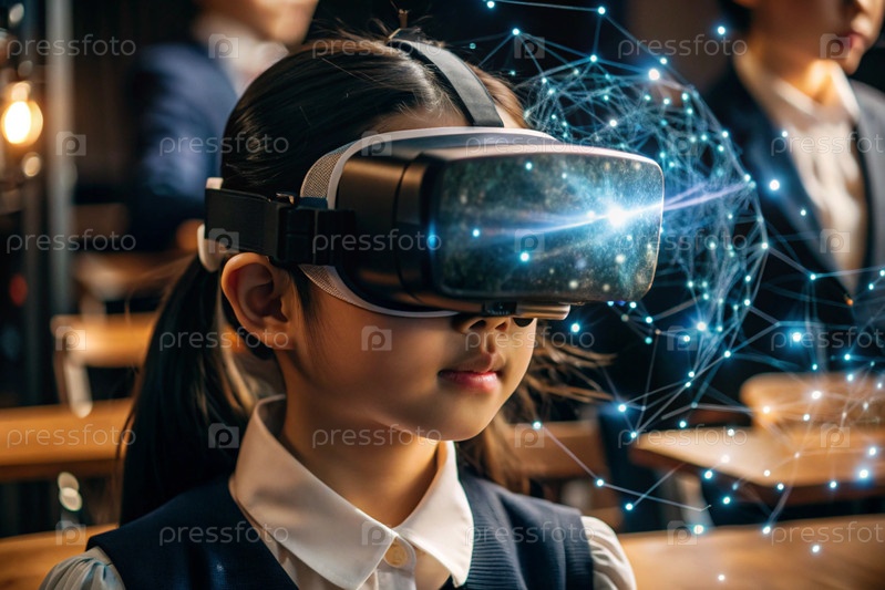 Азиатская девушка с очками виртуальной реальности.Ребенок находится в классе, а другие ученики на заднем плане.Цифровой интерфейс отображается в наушниках