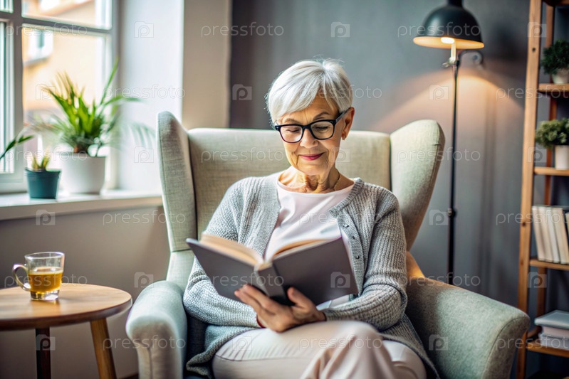 Пожилая пенсионерка, современная бабушка в очках, читает книгу во внутренней части гостиной, сидя на стуле дома при естественном свете