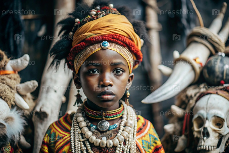 Красивая африканская девушка в традиционном национальном костюме. с костями. портрет символизирует традиции, культуру и красоту африканского народа