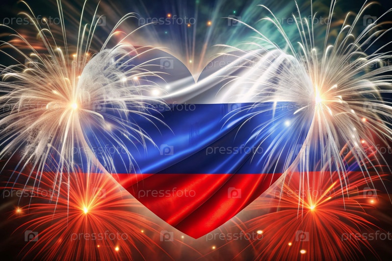Россия. Москва. Национальный флаг Российской Федерации на фоне фейерверков. Русский триколор. День России отмечается 12 июня