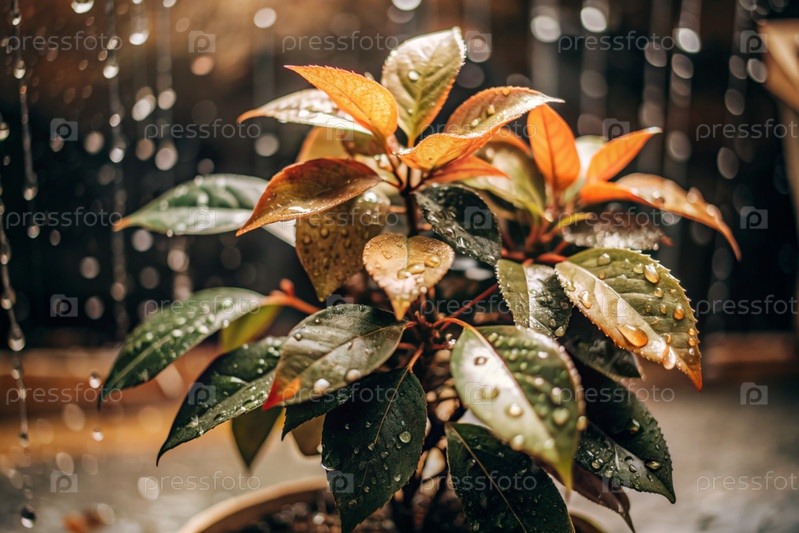 Макрографический крупный план красно-зеленых листьев, капли воды на листьях