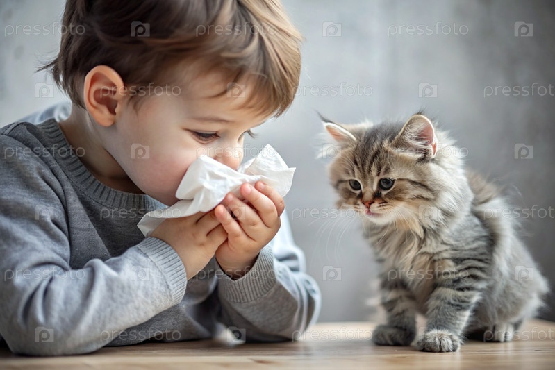 Маленький мальчик чихает в белую салфетку дома. Аллергия на волосы кошек и домашних животных. Рядом со мной сидит котёнок