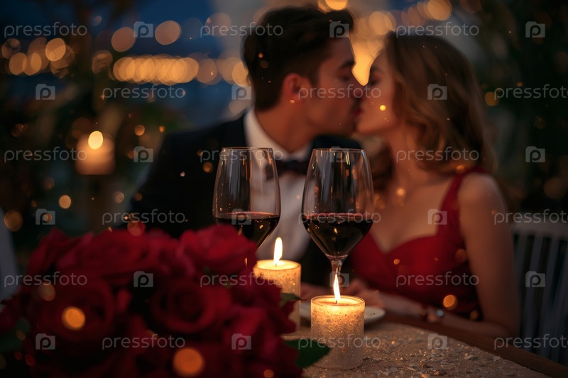 Концепция Дня святого Валентина: элегантная пара, целующаяся на романтическом ужине при свечах с бокалами вина в роскошный вечер