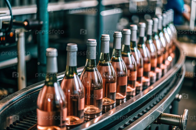 Пищевая промышленность. Конвейерная лента. Линия розного вина в стеклянных бутылках на фабрике. Близкий план бутылки розового игристого вина
