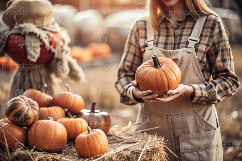 Руки женщины в квадратной рубашке с тыквенным крупным планом и красивым осенним рисунком. Сбор тыков. Концепция празднования Дня благодарения и Хэллоуина