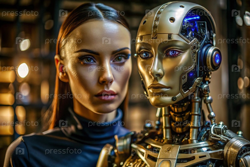 Женский робот-киборг. Интеграция технологий и человеческого взаимодействия. Производство роботов. Искусственный интеллект, Интернет и цифровые технологии будущего