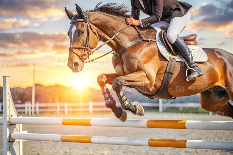 Близкий план олимпийской лошади и всадника, перепрыгивающих через препятствие на открытой арене - это конная езда