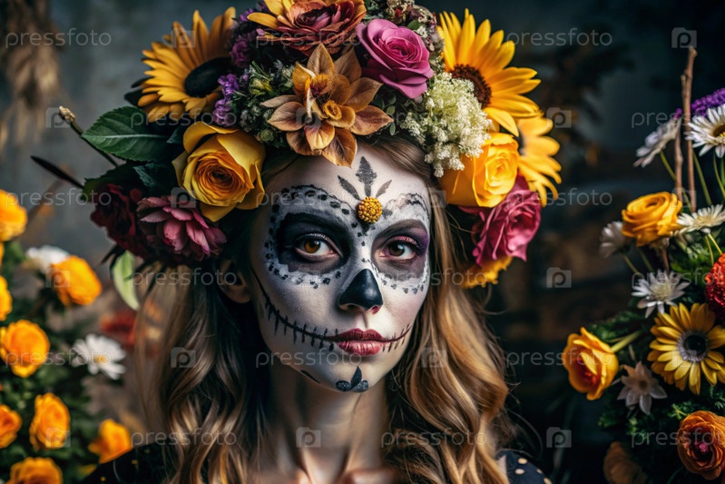 Концепция Хэллоуина. Ужасно. Костюмированная вечеринка. Красивая женщина с покрашенным черепом на лице и цветами на голове. Баннер, открытка