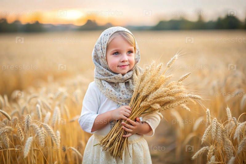 Русская девушка в белом платье и русском шале держит золотые колосья пшеницы на фоне созревающего поля. Концепция посадки и сбора богатого урожая. Сельский пейзаж