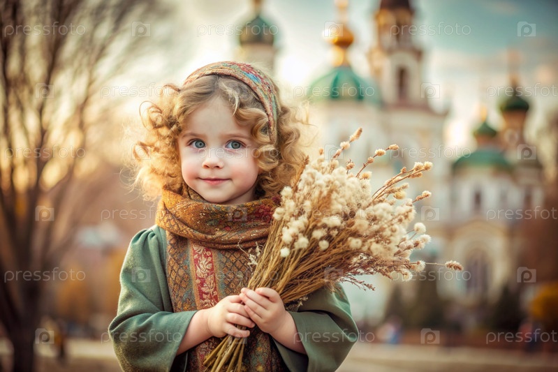 Портрет трехлетней девочки в русском народном шале с букетом дикой травы в руках на фоне православной церкви