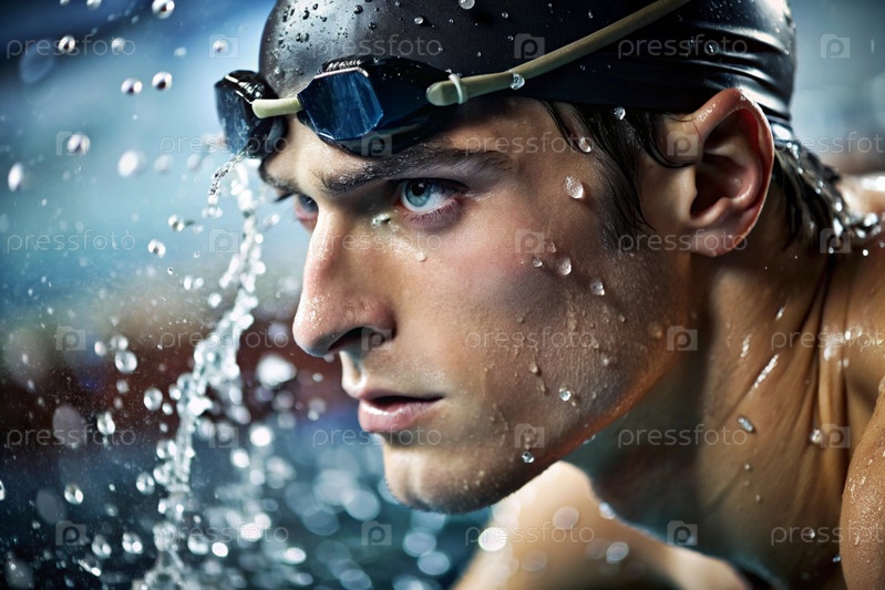 Спортивное плавание. Мужчины-плаватели. Спортсмен с очками в бассейне во время соревнований на близком расстоянии. Человек смотрит на камеру