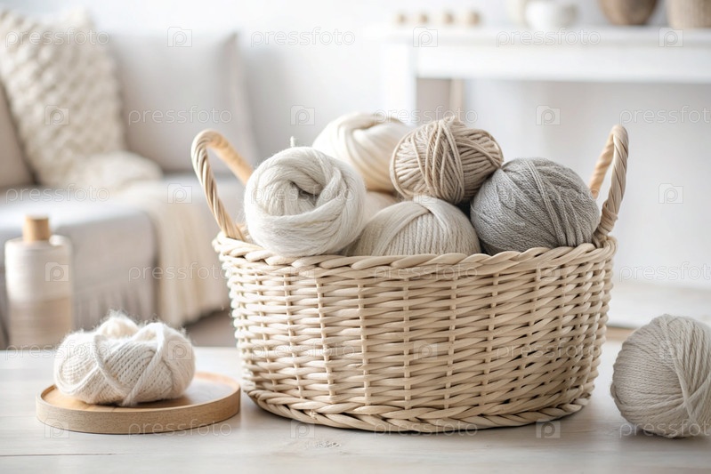 шарики пряжи в корзине из плесеня в белых и бежевых тонах швейная работа, текстиль, вязание зимний сезон, малый бизнес, ручная одежда