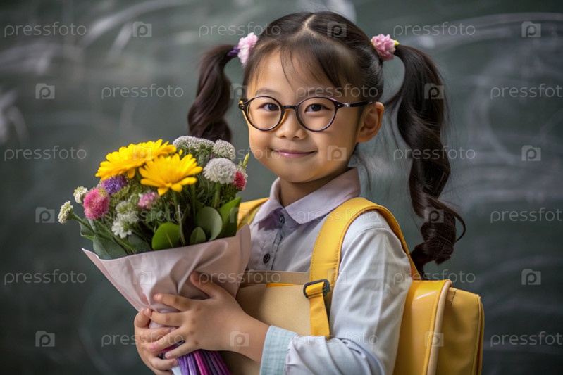 Первоклассный азиат с очками на доске. Девушка держит цветы в руках. Ребенок пойдет в школу впервые. Ребёнок с рюкзаком, книгой и цветами. Возвращение к школе