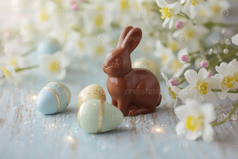 Шоколадное пасхальное яйцо, шоколадный кролик и весенние цветы на деревянном фоне. Пасхальные сладости и лакомства. Концепция яркого праздника Пасхи в 2026 году. Хорошая открытка