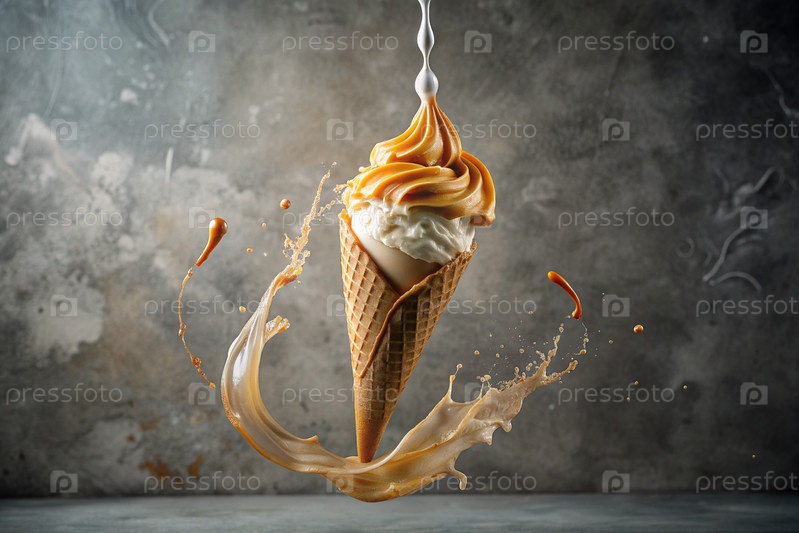 сладкий десерт. мороженое с ароматизированным карамелем. белое ванильное мороженое на фоне серых тонов. карамэль, капающий в мороженом