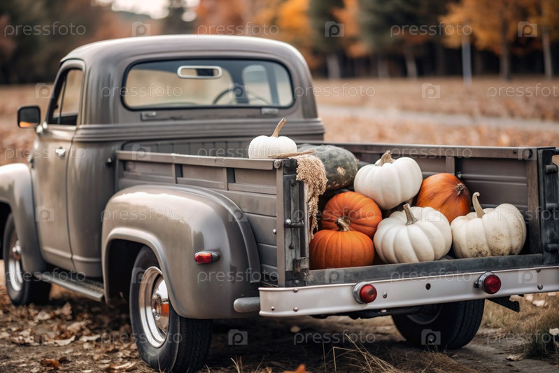 Осень, осенний дизайн.Большой урожай тыквы на заднем сиденье ретро-пикапа, крупный план