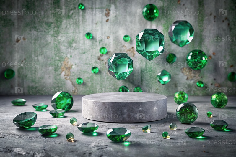 Минималистский фон для демонстрации ювелирных изделий. Современная пустая трибуна с серой стеной и изумрудами. Креативный дизайн презентации продукта
