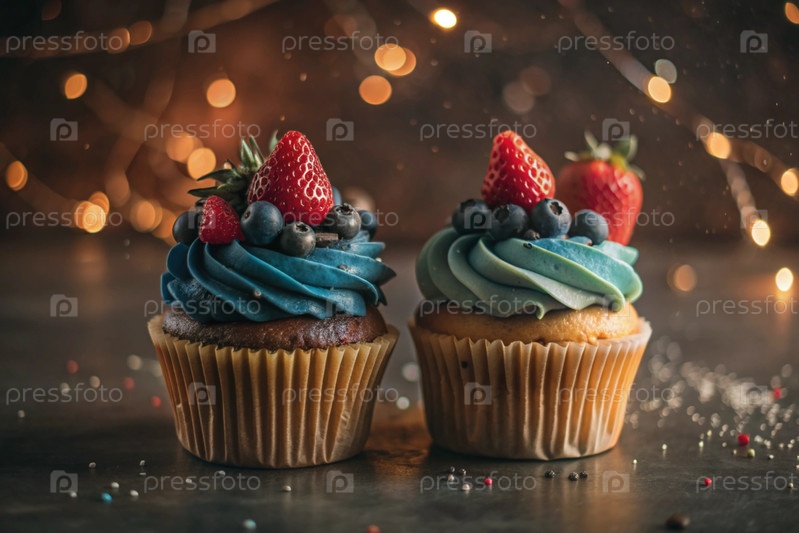 Вкусные красочные кексы со земляницами и чернилами. праздничный кекс, который идеально подходит для веселых торжеств. счастливого дня рождения