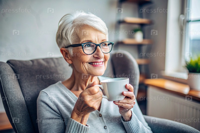 Пожилая пенсионерка, современная бабушка в очках, пьет кофе из кружки во внутренней части гостиной, сидя на стуле дома под естественным светом