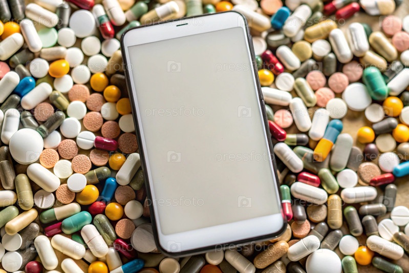 Здоровье и медицина. Аптека, онлайн-заказ, покупка и доставка. Смартфон с пустым экраном на куче красочных таблеток, таблетки, капсулы, диетические добавки и витамины