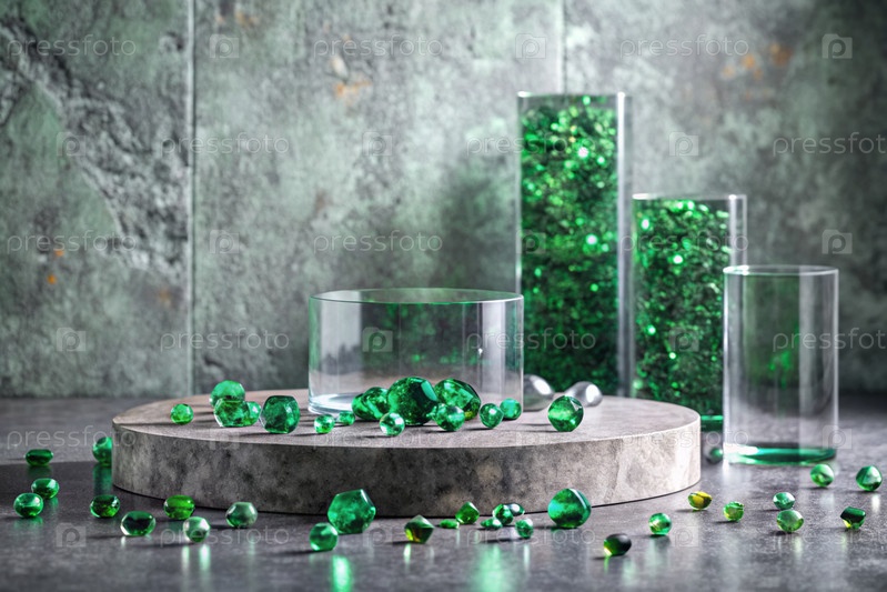 Минималистский фон для демонстрации ювелирных изделий. Современная пустая трибуна с серой стеной и изумрудами. Креативный дизайн презентации продукта