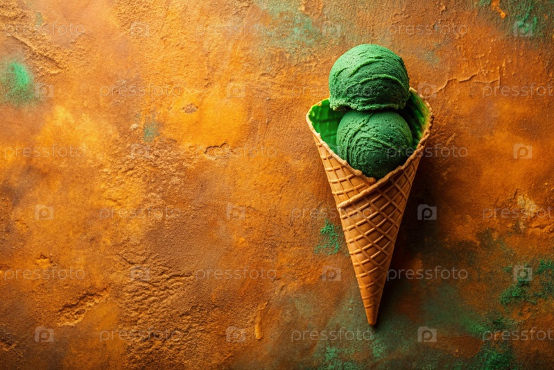 Сладкий десерт. Стильная современная концепция. Зеленый конус мороженого на ярко-оранжевом фоне. Всемирный день мороженого