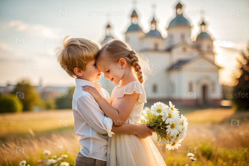 Всероссийский день семьи, любви, верности. милый мальчик и девочка с букетом ромашек на фоне православной церкви. День святого Валентина Петра и Февронии. религия, христианство