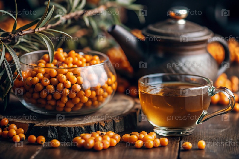 Здоровая, спелая ягода морского гречневого терна в ближайшем плане.Витамин, оранжевый, осенний, сезонный чай из ягод морского гречневого терна на темном фоне.Яблочный чай для иммунной системы