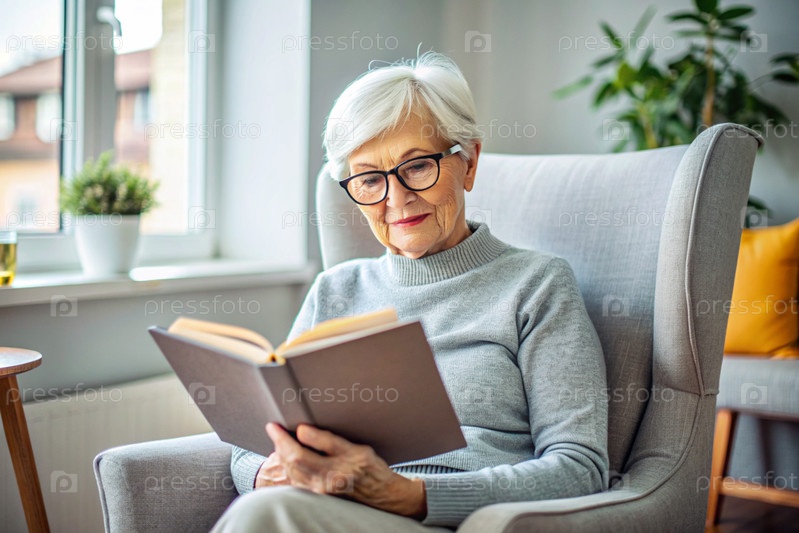 Пожилая пенсионерка, современная бабушка в очках, читает книгу во внутренней части гостиной, сидя на стуле дома при естественном свете