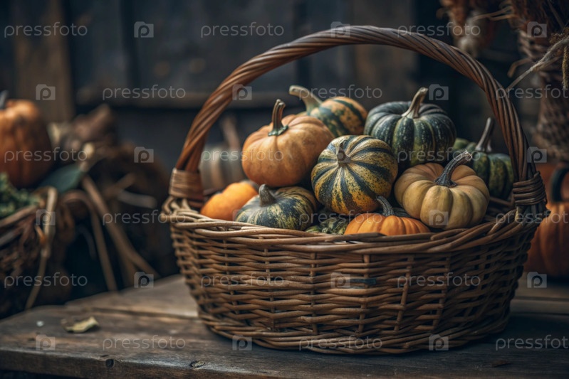 Осенний фон красочные декоративные тыквы в плетеновой корзине богатый урожай концепция Хэллоуина