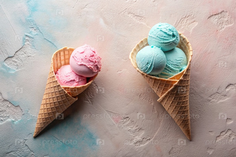 Баннер.Сладкий десерт.Конусы мороженого с разными вкусами.Голубое, розовое мороженое на фоне двух пастельных цветов: синего и розового