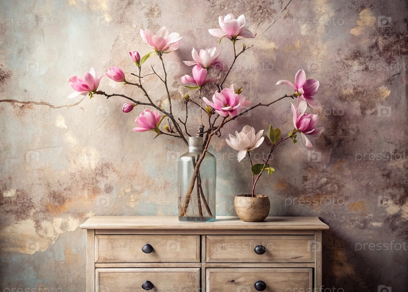Красивая ветвь розовой магнолии в стеклянной вазе и флаконы на старом деревянном шкафу. Букет цветов в вазе в интерьере дома. Светлый, бежевый, розовый цветочный фон