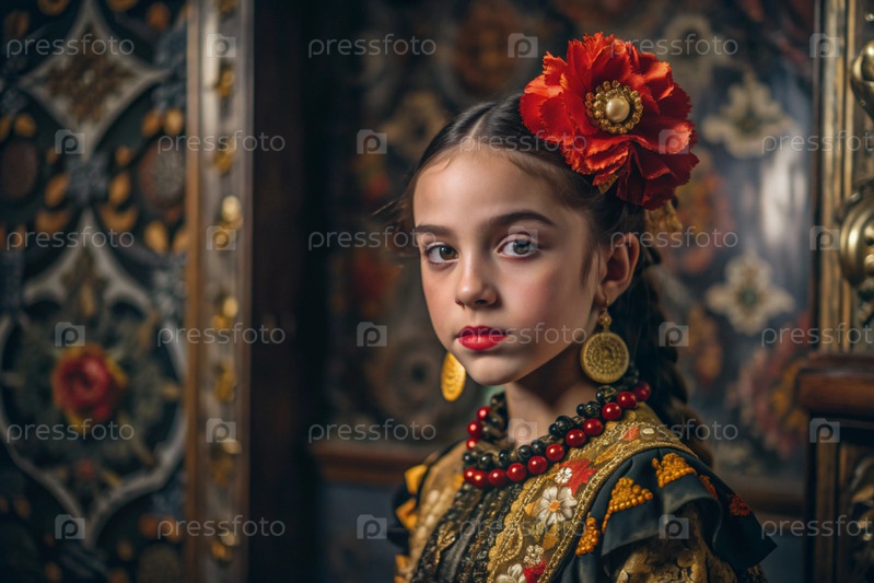 Испанская девушка в традиционном испанском национальном костюме. Перед быком. Бикоборство. Портрет символизирует традиции и культуру народа Испании