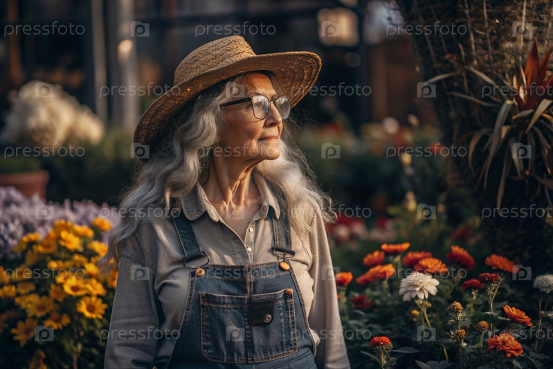Пожилой садовник с седыми волосами в комбинезоне в уютной цветочной теплице