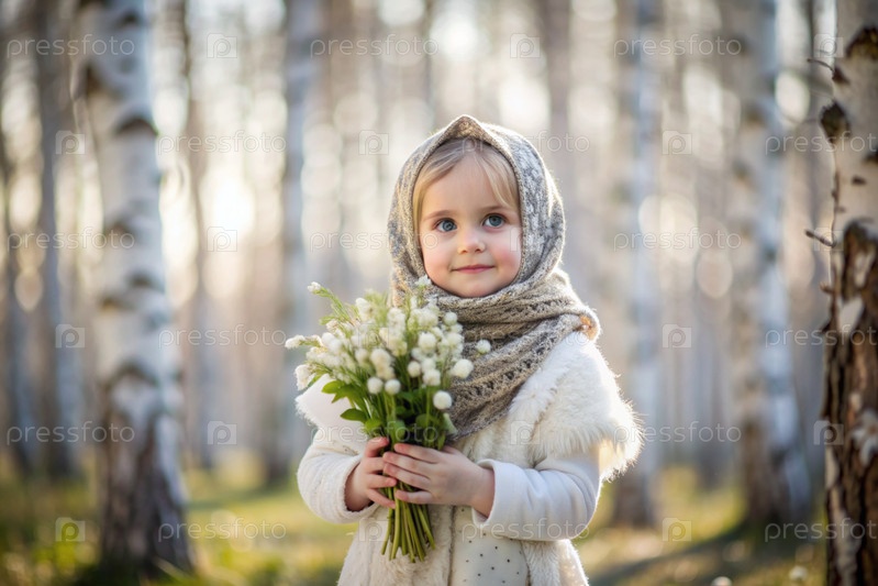 Русские народные традиции.Русский аромат.Красивая девочка в национальном русском платье и шарфе в красивом березовом роще.Портрет прекрасной девушки в березном лесу